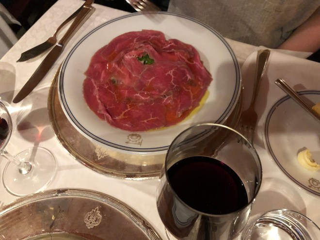 Our dinner was quite good and the staff could not have been friendlier. Jenny of course was thrilled with carpaccio, once again. As well as, we had watched the waiter making steak tartare for another table and were intrigued with their methods. I was telling Jenny how tartare had been one of my dad’s favorites, and how excited he would get if my mom made it or a restaurant had it on the menu. The waiter, obviously appreciating our interest in his tartare making skills asked the table if they would allow him to serve us a small portion to taste, to which they obliged. Billy wouldn’t partake, but Jenny and I gladly did and it was delicious-raw egg and all-another thing my dad and Jenny had in common apparently-their love of raw meat!