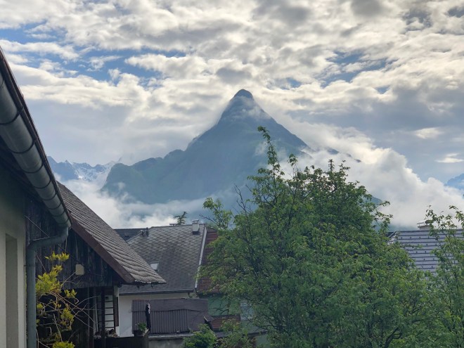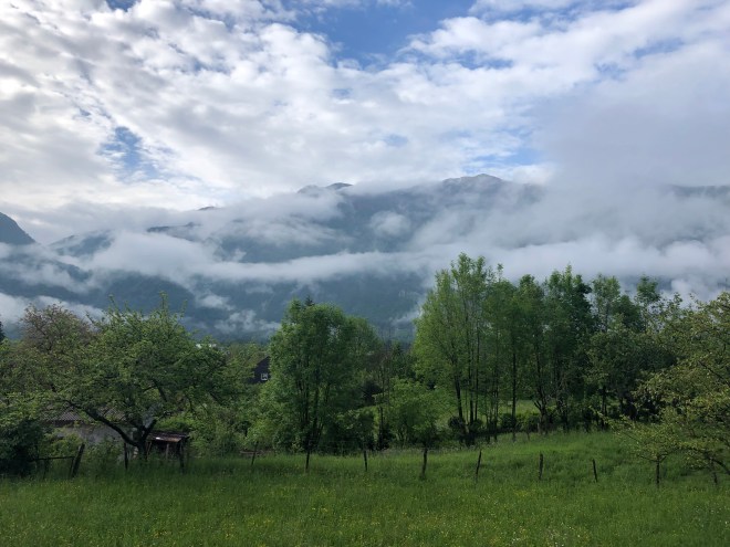 We chose the best restaurant in town for my birthday dinner, which turned out be exquisite-in every way. It was a set menu and we all three ate every last tasty morsel from the venison appetizer, to the trout and asparagus second, the duck and potato main, and the desert which was some concoction of cheese, pepper, ice cream-all matched with incredible Slovenian wines, eaten in a lovely setting looking out at the now clear mountains. A final birthday gift on a truly magnificent day!
