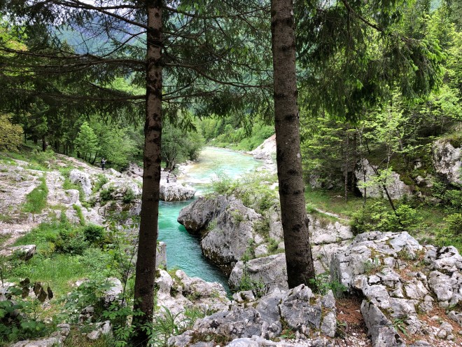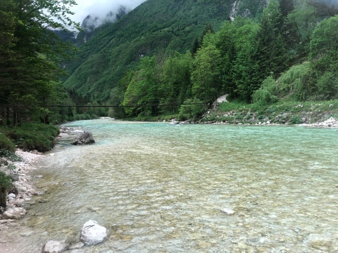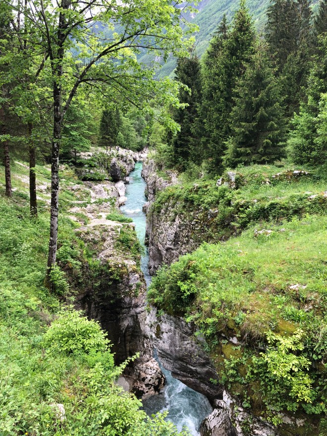 We thought it amazing how we had left the sea and the flat agricultural fields and within minutes of crossing the border, were in an environment that was lush and green. We felt more like we should be in South America somewhere than Europe. We quickly entered into a river valley with verdant mountains on both sides. The sinuous road followed along the cyan Soča River-a river we would basically follow to our final destination. Driving in Slovenia was easy enough, and cruising along in a stick shift VW was kind of fun-a throw back to my high school days (except this one had six gears instead of five).