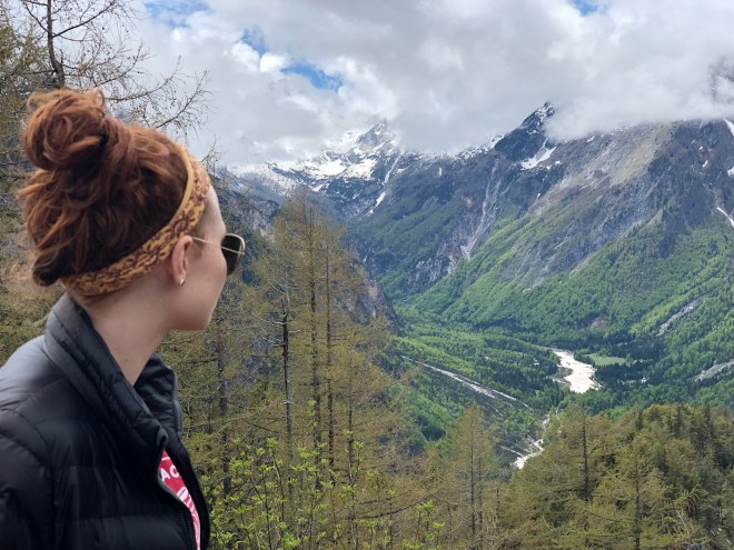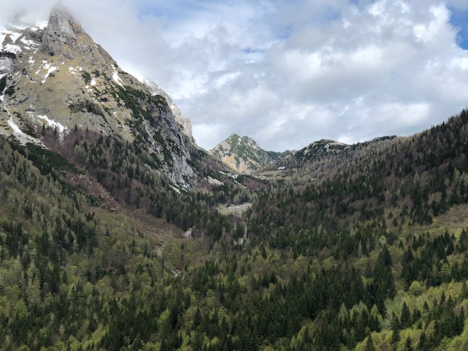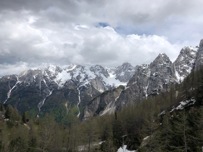 But…we woke up to blue skies-not a rain cloud in sight- and the very last thing I could imagine was to sit in complete darkness when we finally had some sun. So the decision was quickly made to go to Ljublana over the Vršič Pass-the very same windy road we drove yesterday! You have to be nuts, or desperately seeking mountain views to subject yourself to that road again but I am afraid we are both. We figured we could finally see the mountains in all their glory and experience the Julian Alps in the way we had hoped to. Since we had already made the stops, and were at least familiar with the road, we thought it would not take us too long to retrace our steps, and we would have the added benefit of the natural beauty surrounding us.