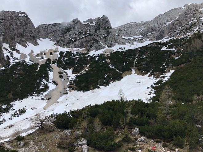 From the look out point, we could see the top of the Vrsîc Pass just up from us so we knew that would be our next stop. It was probably less than a mile’s drive but how quickly the terrain changed from a mixed deciduous forest to an alpine meadow one-with the dainty alpine flowers and purple heather covering the ground, along with snow! We pulled the car in and made our way over to a point where…mountains…we could see them! Yes-finally! My secondbirthday gift of the day!