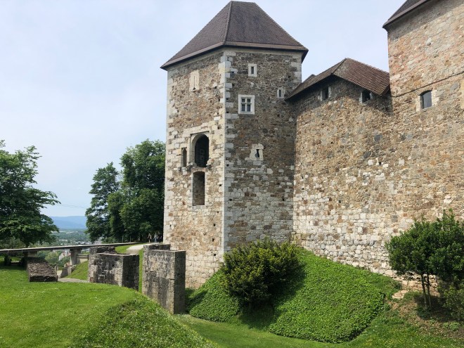 We climbed up to the top of the lookout tower, with me holding the map over the corner of my eye, acting like a blinder so I did not see just how high up and how steep the stairwell was. The view from the top was spectacular-a 360° view of all of Ljubljana and the gorgeous countryside-all the way out to the mountains (just not the peaks today). Really spectacular and worth the price of entry alone for the view. We have decided that the castles in Slovenia, are pretty lame. There is really very little to see in them, unlike the castles of some of the other European countries we have been to-oh well-I guess you can’t have everything.