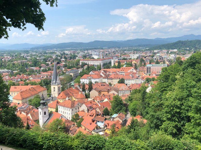 After breakfast, we decided we would go to the castle that has loomed over Ljubljana for the last 900 or so years. It was an easy ride up the funicular, giving us our first views out over the beautiful red roofs of Ljubljana. It was too bad that the mountains off in the distance were covered in clouds, but really…no complaining here!