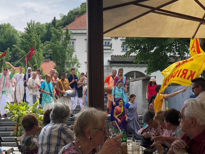 By this time we were ready for lunch so I chose a restaurant that looked like it had a full menu-a total carp shoot. Turned out it was a delicious lunch with extremely friendly service and free entertainment in the form of Hare Krishnas dancing through the streets.