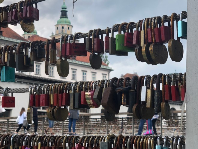 We enjoyed the stroll back down the hill and walked along the streets of the old town, through the Saturday market, across the Butcher’s Bridge, aka the Bridge of Love, with all the locks hanging that the lover’s put on to demonstrate their eternal love and then throw the key over into the river. Jenny was funny, pointing out one and saying that that guy must not have been too sure about his relationship as he used a padlock with a dial combination.