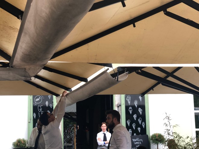 See the waiters attaching the gutters!