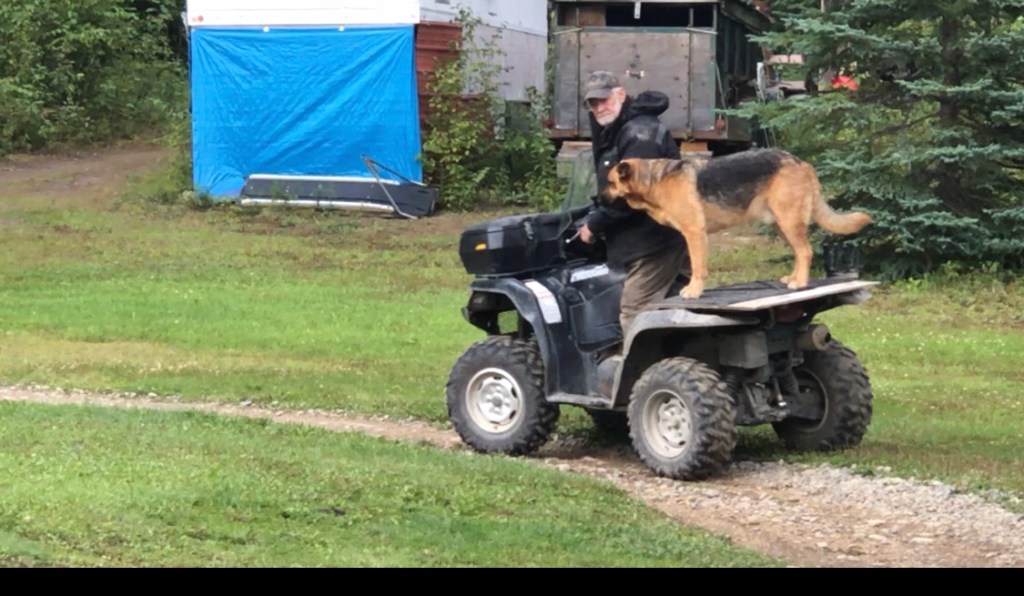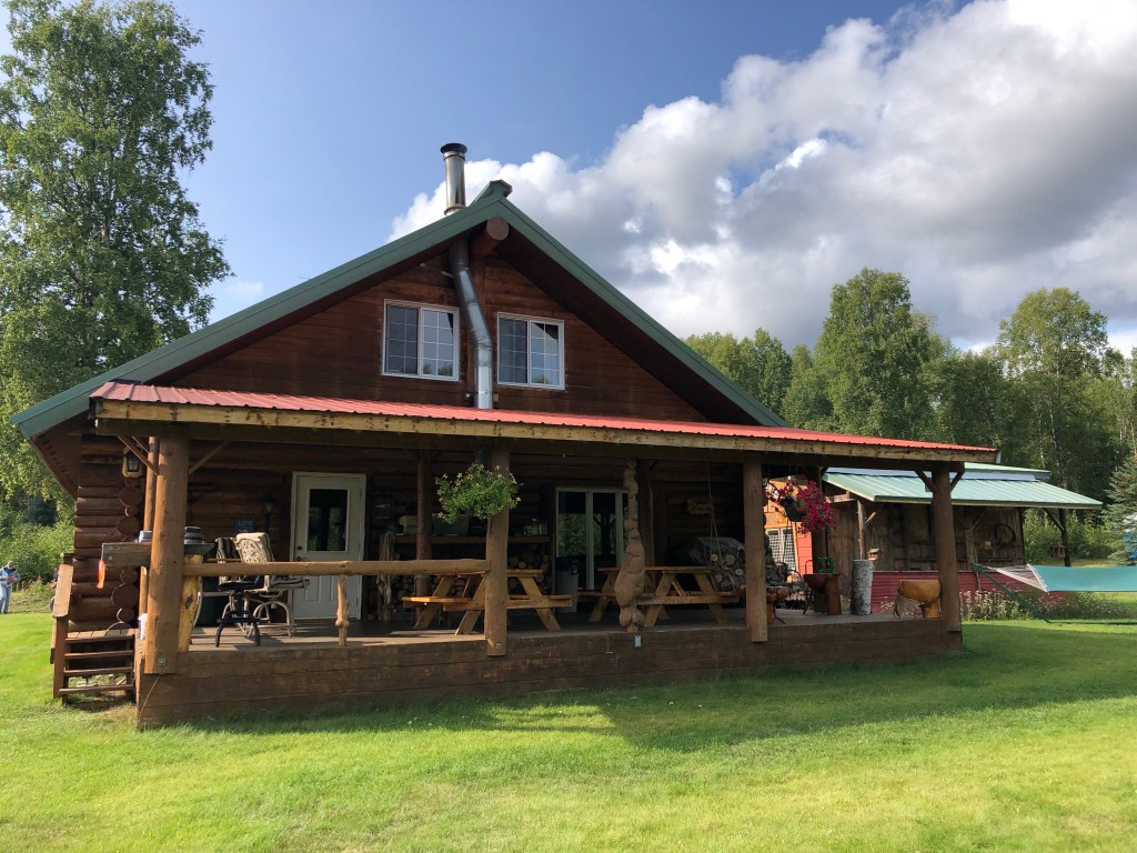 We continued for another 6 or 7 miles until we arrived at the summer home of our tour leaders. Dennis parents arrived here in 1959 with five children. They homesteaded 115 acres, building an 8’x12’ “house” with an upstairs loft that all five children slept in. The original cabin is now in disrepair and he has since built himself a modern log cabin that runs off a generator as it is off the grid. The location is spectacular- in the absolute middle of nowhere, only reached by ATVs in the summer or snow machines (as they call a snowmobile in Alaska) in the winter. So so cool!
