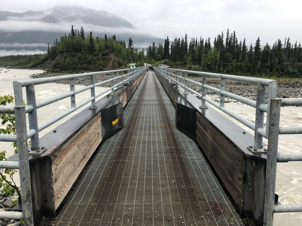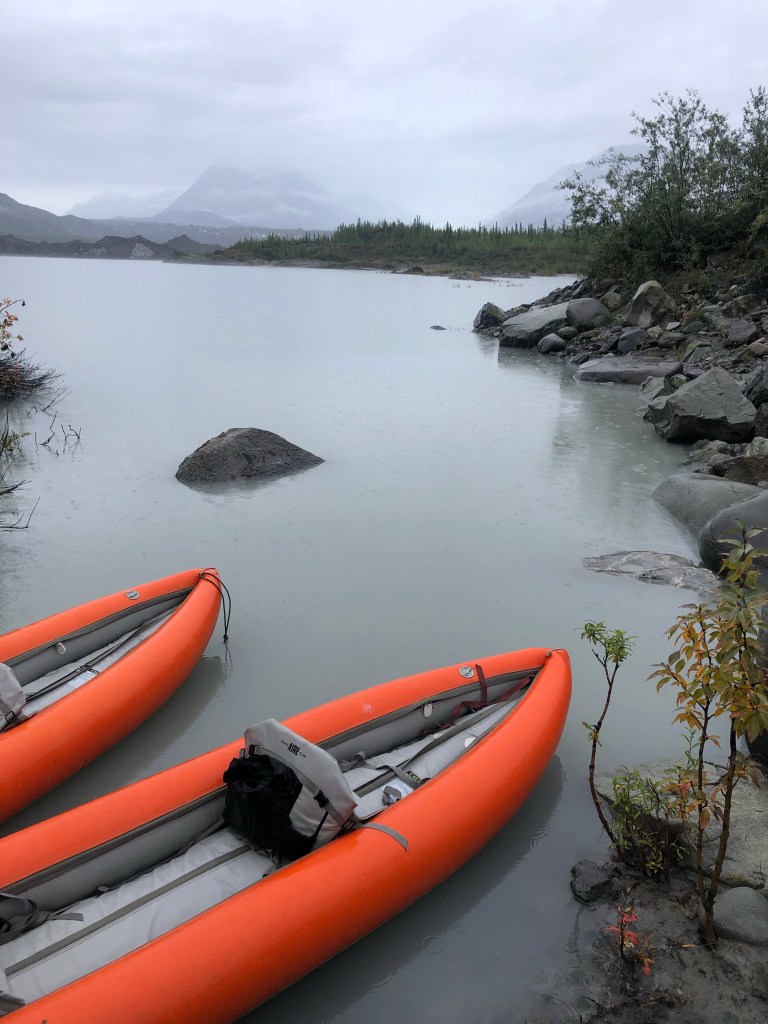 After coffee and cereal we hustled out to meet our guide for the day’s adventure. Today we would be doing a 1/2 day tandem kayak with St Elias Guides, on a glacial lake fed by the Kennicott Glacier. We drove the last three miles to the end of the road where we parked and walked across the footbridge, the only real way for tourists to get into town. Years ago you had to pull yourself across in a handcart but the bridge is certainly a bit better!