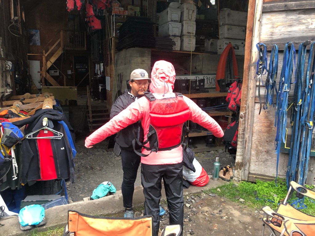Our guide Clint got us outfitted in a neoprene layer, over which we could use our own expedition clothing. Billy had forgotten to bring his rain pants but Jenny and I had ours. He also gave us rubber boots and gloves to wear- none of which were remotely warm!