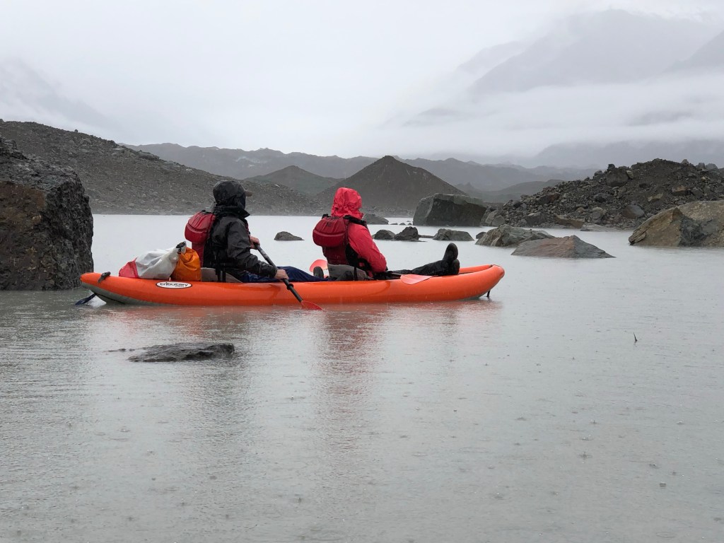 As we kayaked along, debris was falling down along the ice and into the lake. As we looked 60’ up the glacial wall, we hoped the monstrous glacial erratics didn’t come loose and tumble down – those would certainly create a small tsunami! We have seen glaciers before in Patagonia and watched the ice valve but we had never seen the process of glaciation at work. The crazy thing is we were really kayaking on the glacier as the melt waters filled in a low spot on the terminal moraine, creating a lake, so the glacier was under us. It was so cool;