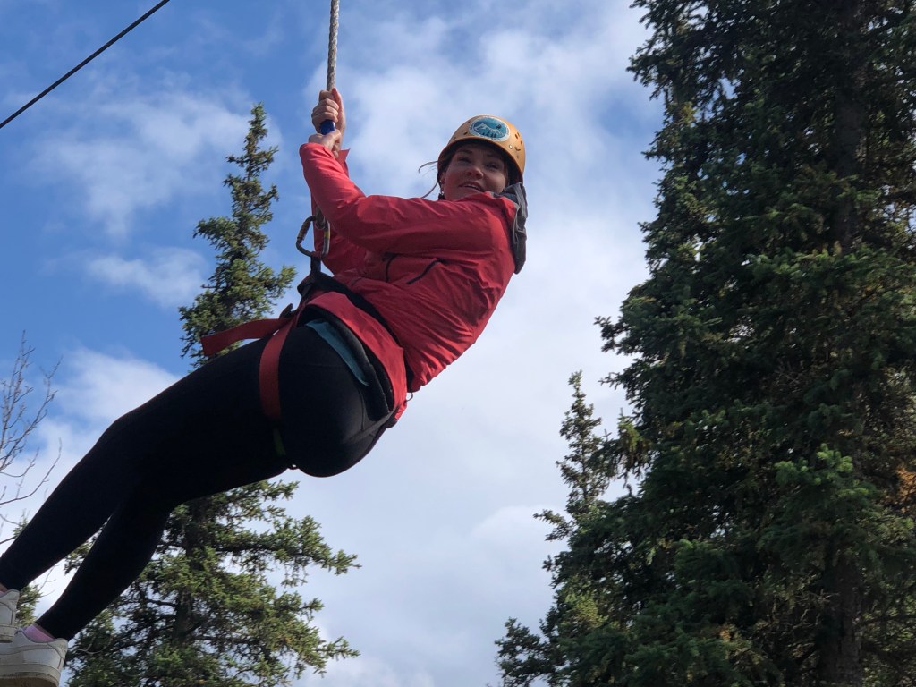 The first line required a climb up a tower that you then launch from, sending you through trees, maybe 30 feet off the ground. Billy volunteered to go first – having no issues whatsoever; Jenny followed behind. There were six other people zipping, including a hot shit 80 year old woman!