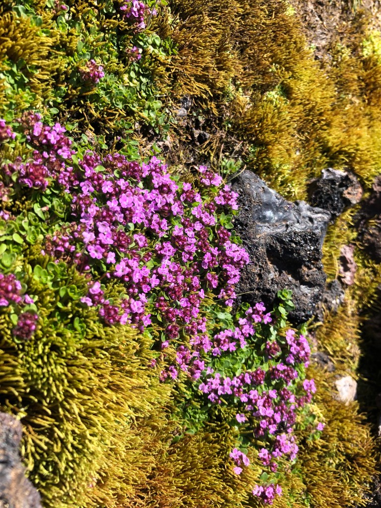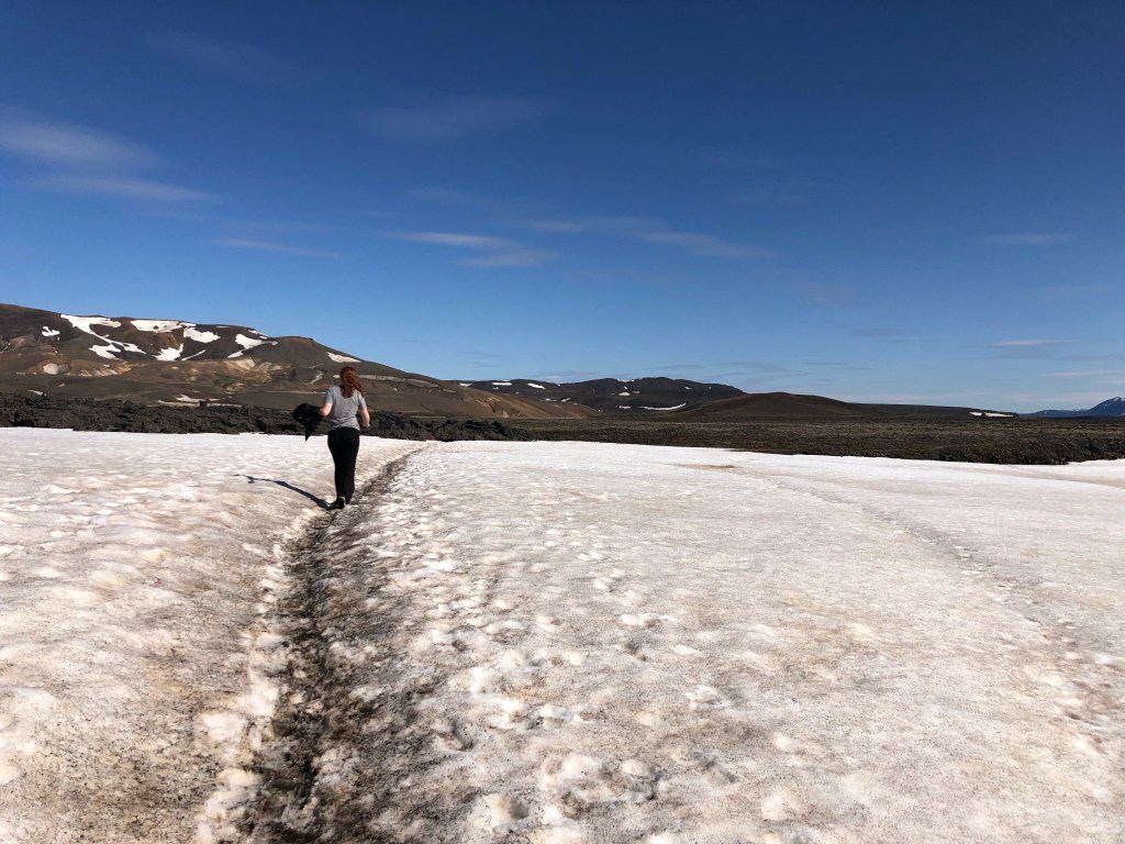The trail started off with us trudging through still present snow drifts and across wooden boardwalks that kept you off the fragile areas. We were not actually too sure what we were going to see but I had chosen it as one of the stops out of the many recommended that I thought would interest us. As we climbed up we arrived at a platform that was overlooking a fairly large colorful thermal pool. From there, we continued the march uphill until we reached an area of hardened magma with steam pouring forth from countless cracks and fissures – these lava fields stretched as far as the eye could see in some directions. Again, a new experience actually walking along a still active volcano – though it last erupted in 1984, concluding a continual ten year eruption cycle. The total hike up and around was maybe 3 miles with incredible scenery and views the entire time.