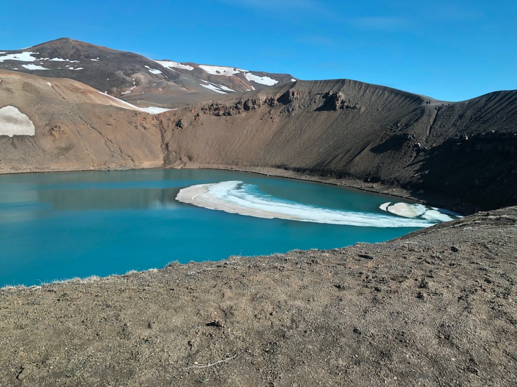 From the top of Leirhnjükur, we could see a collapsed volcano crater across the valley with a parking lot and walkway leading to the rim. A quick detour here proved to be rather unique as well, as the crater was filled with a beautiful teal colored lake that was still holding some winter ice.