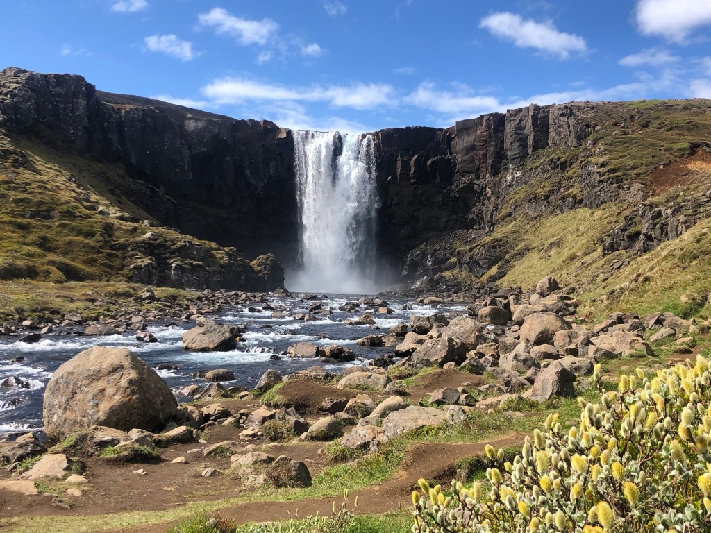 After stopping to admire the beautiful Gufufoss Falls, we made our way back up and over the pass. If there was one thing that has frustrated me about Iceland, it is that there are very few pulloffs along the road. I am so used to hitting the brakes for a photo op and in Iceland, it is rarely possible – there is zero area to ever pull off (it is like the roads are all raised and there is a mere inches on the outside of the right line – so much so that I was in shock to see a police officer having pulled a car over and they were completely blocking the one lane of the two lane highway that is the Ring Road), so stopping for an inspirational scene is pretty much out of the question.