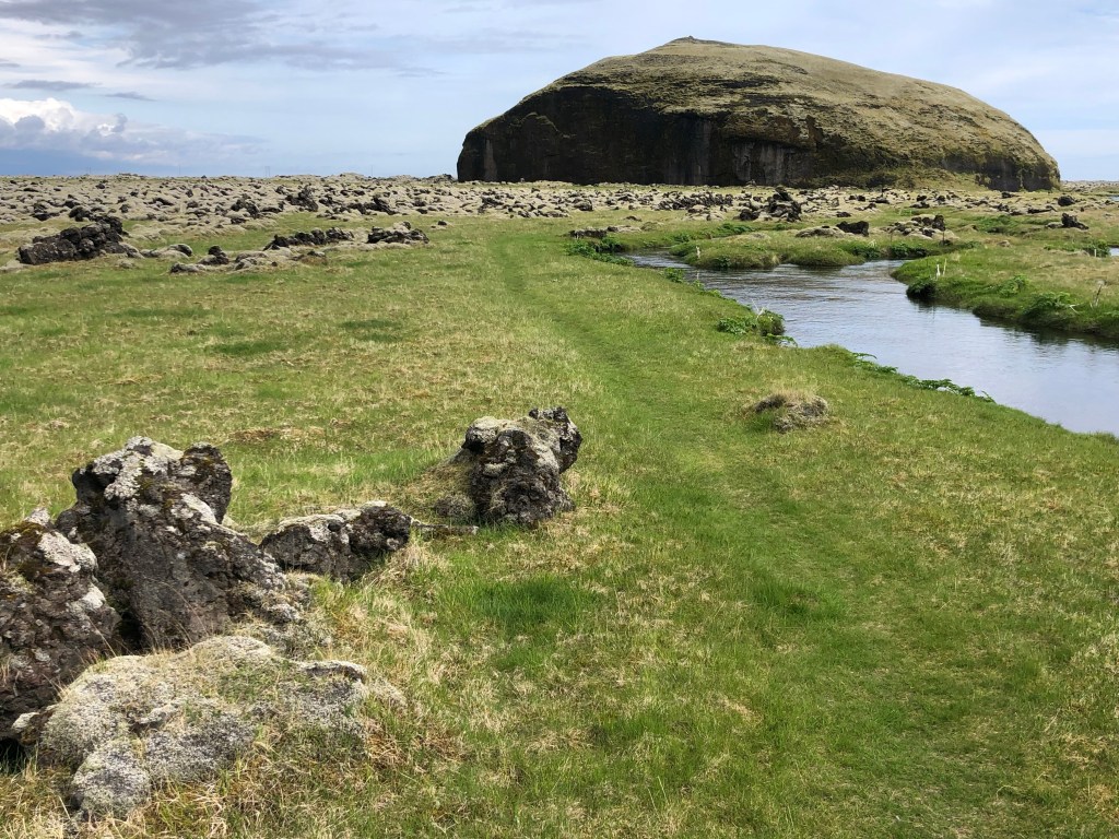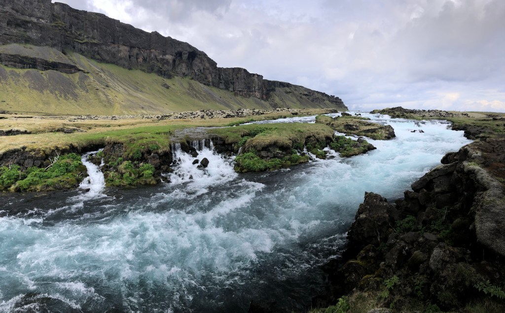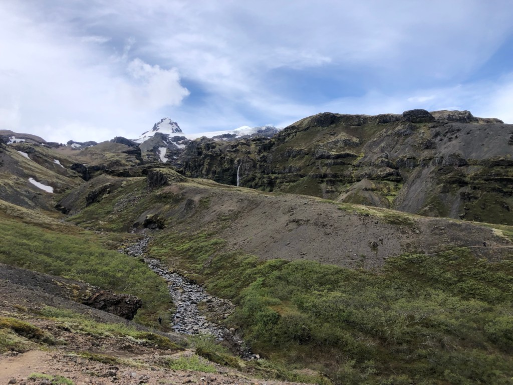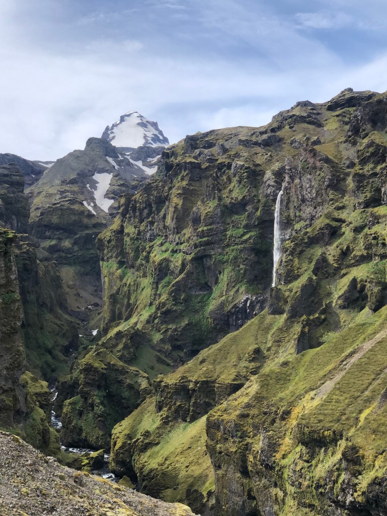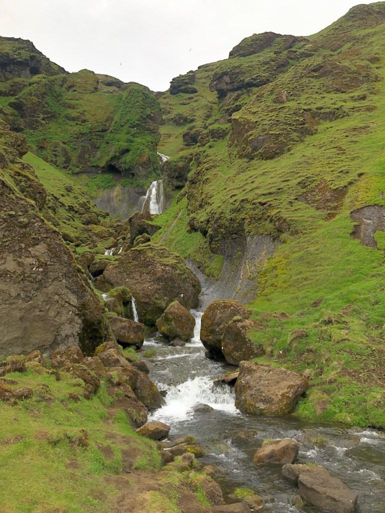 Another hour and a half down the road brought us to Mulagljufur Canyon (this is one of the completely unmarked sights in Iceland but perhaps they want it that way). I hadn’t read too much about it but what I did read I thought it sounded like a good stop and a nice hike. It turned out to be both with the hike being a real butt burner as it was straight uphill for a good mile, mile and a half but the views into the canyon were beautiful, and we appreciated the slightest break in the clouds for some sun shining on the greenery and the blue skies just above.