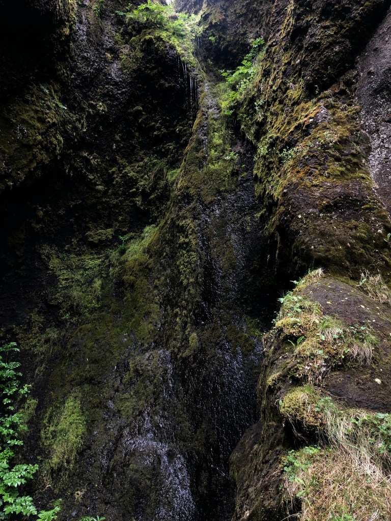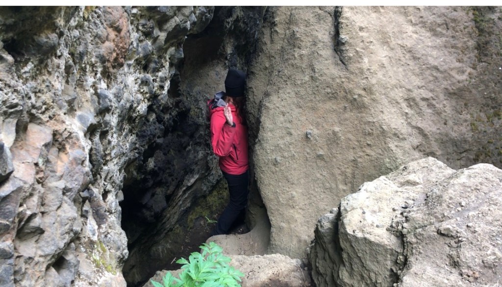 Jenny and I continued to the hike and our clmb up, up, up and in doing so we lost all visualization of the valley below and began hiking into fog. We hit another crossroads and couldn’t figure out where we were so in the mind of safety, I decided it best we return the way we came and throw in the towel on hiking, but not before we took a turn and ended up scrambling up, over and in between boulders to check out a cave.