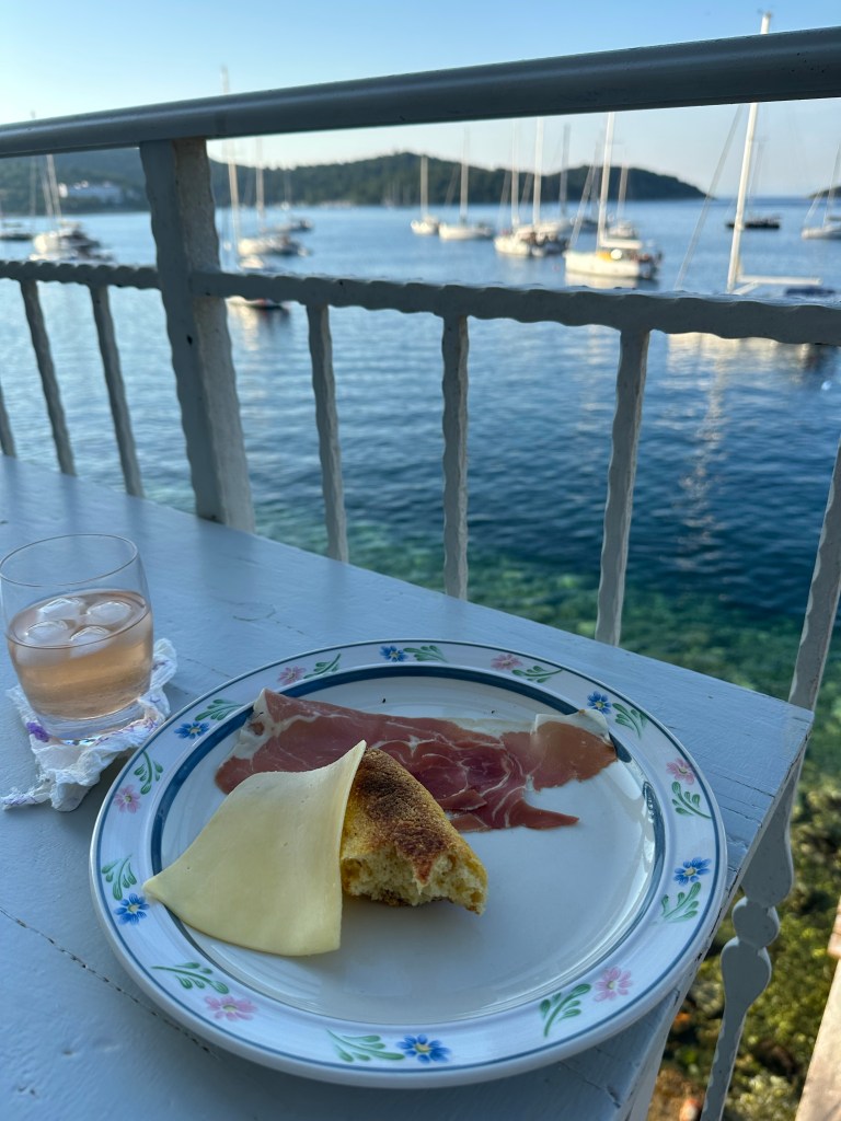 After getting settled I headed out to pick up a few necessities and quickly decided against dining out for dinner but opted instead for a loaf of fresh bakery bread with some prosciutto, cheese and a bottle of rosé – an old standby meal for us when traveling anywhere in Europe. And besides, the view from our little balcony just couldn’t be beat!