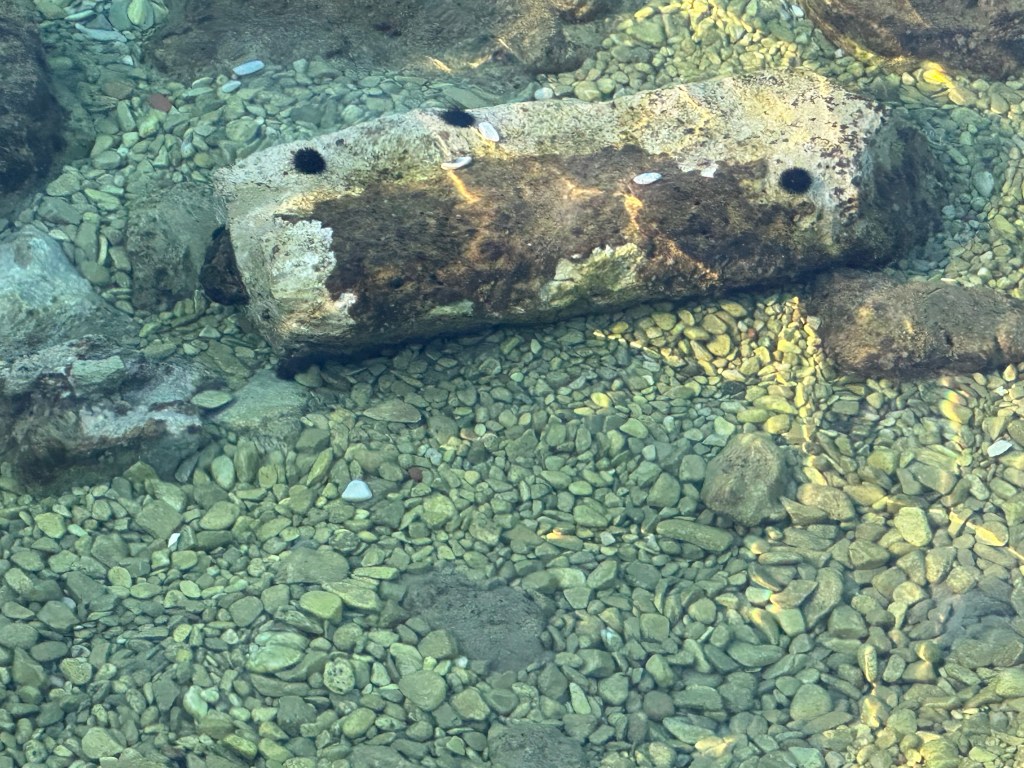 I had lugged hard-bottomed water shoes for all three of us from home as the beaches here are not sandy, they are stone and the water is filled with black spiny sea urchins.