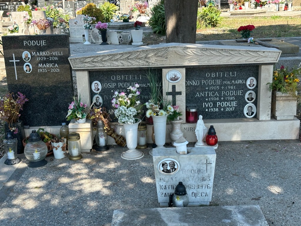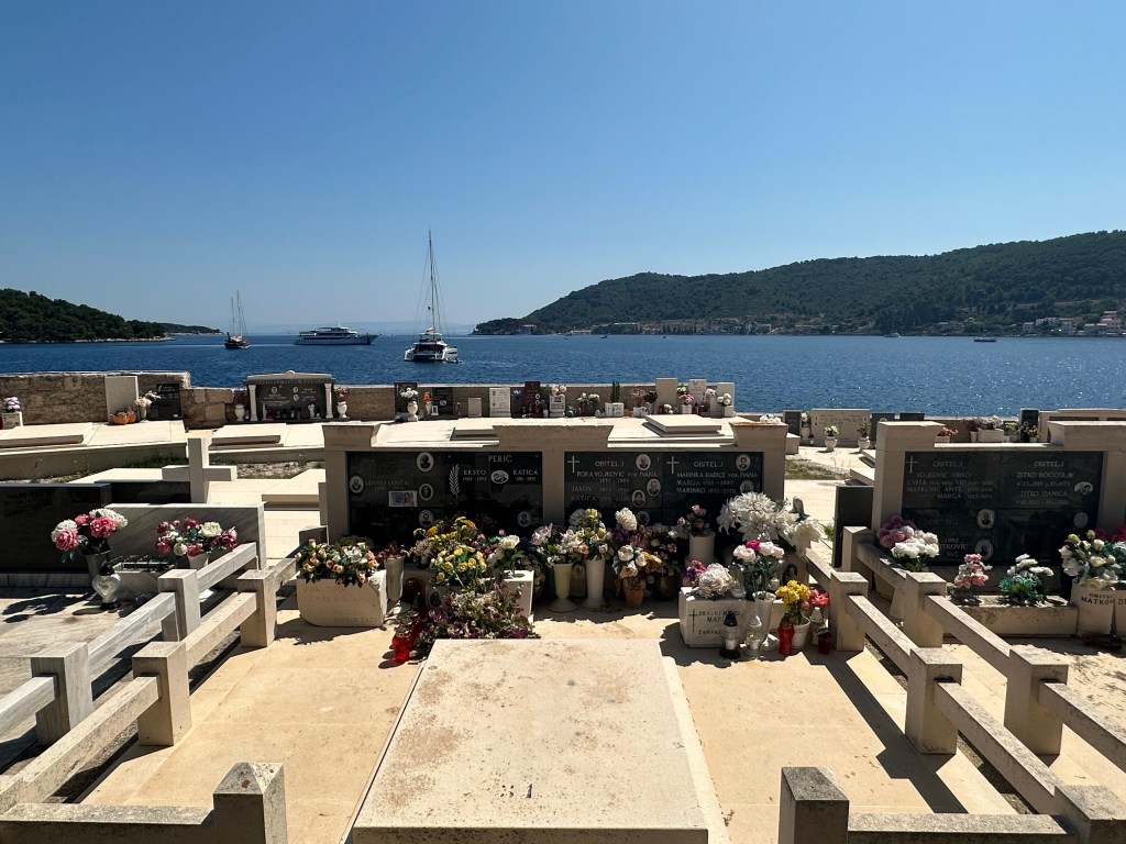 I made my way walking along the crescent shaped harbor back towards where the ferry dock is, noticing it was already hot, much hotter than yesterday with little breeze. I wandered past beaches filled with families, past the partially excavated Roman baths behind locked gates, the monastery which was built on an ancient Roman amphitheater, into a small church (no candles to light), and through the cemetery. I found it so interesting that the graves here are all marked with photos of those that eternally lay below the highly adorned grave sites. This cemetery has to have one of the prettiest locations, out on the tip of a promontory facing back towards the mainland.