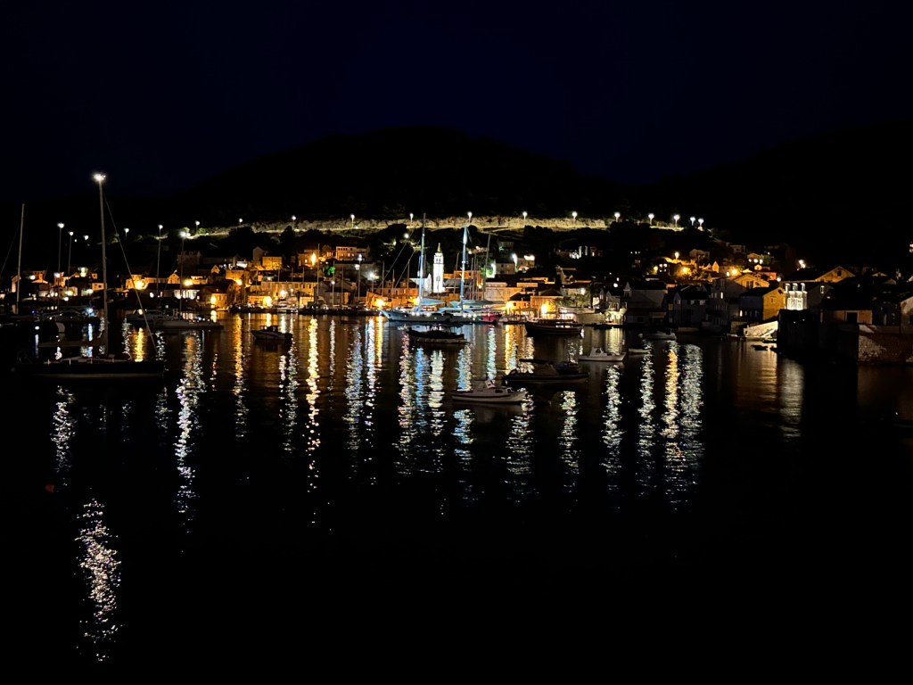 After dinner, the girls hit the bed and I took an evening stroll. The lights along the harbor were lovely but bed was soon calling me too…