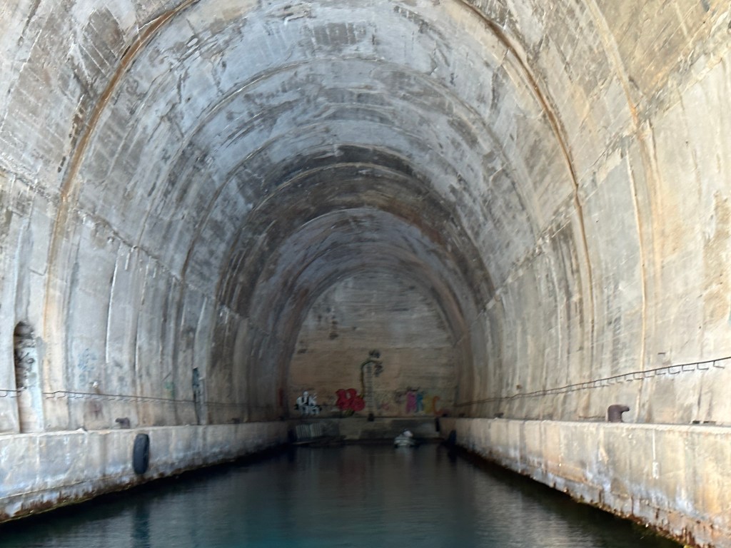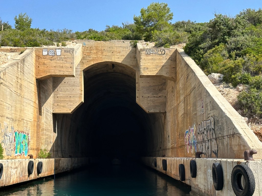 Our route today was a circumnavigation of Vis with a detour over to Bisevo Island where the Blue Cave is located. Our first stop was the submarine tunnel built by the Yugoslavian leader Tito during the Cold War. The tunnel is about 60 feet high and 330 feet long but was never used. It was quite a cool experience going all the way into it.
