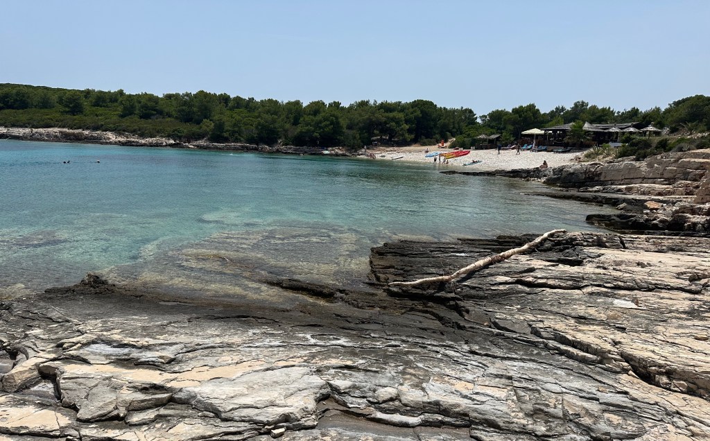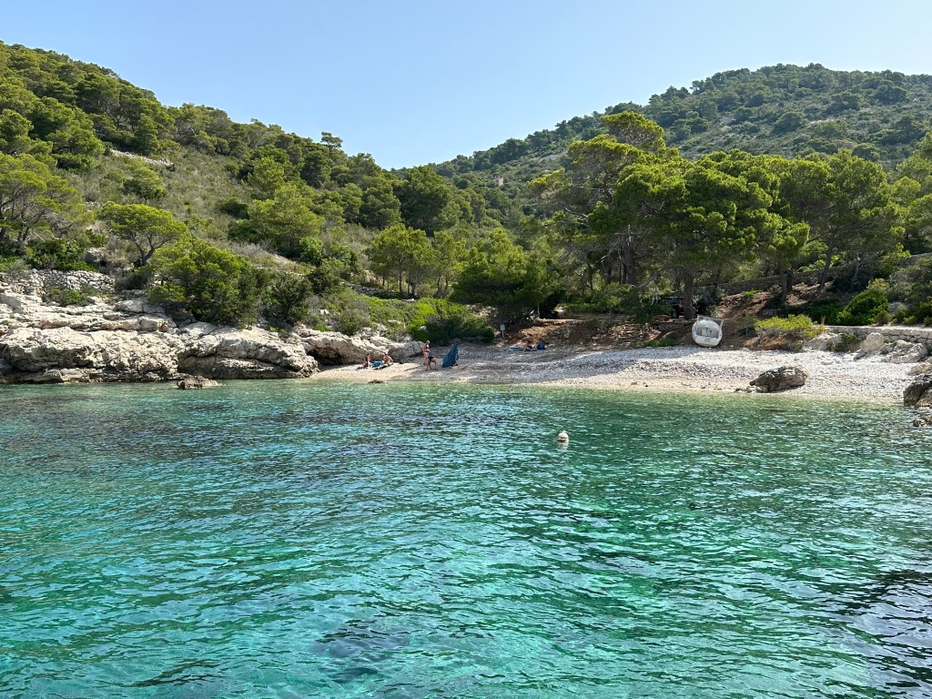 So the last stop on our trip was Ivan’s favorite beach and one that was different from all the others as this was a sandy bottom beach – one of only two on the whole island. Smokova Beach was beautiful, only accessible by boat or a thirty minute hike down from the road, so there was only a handful of other people there. It looked like a giant swimming pool but was just as chilly as all the others stops. By this time, Noella had fallen asleep so Jenny and I jumped in and swam to shore. Jenny really loves to swim, especially dunking her head under, and here since it was sand, we could swim without our water shoes on as there were no rocks for the urchins to cling too!