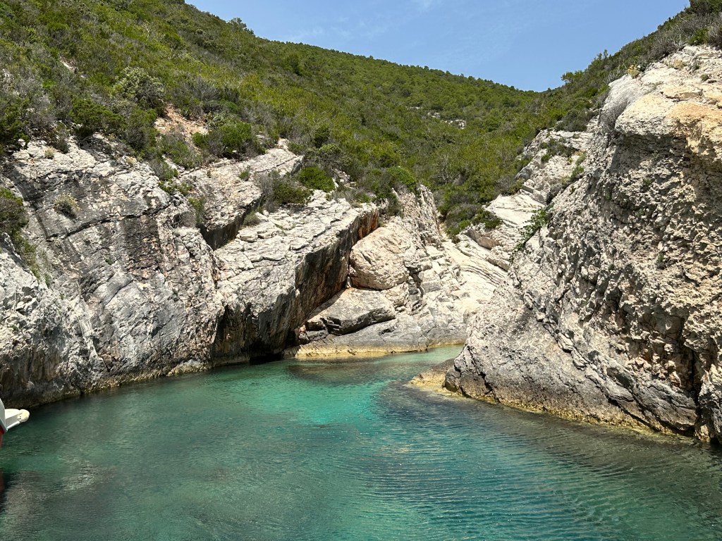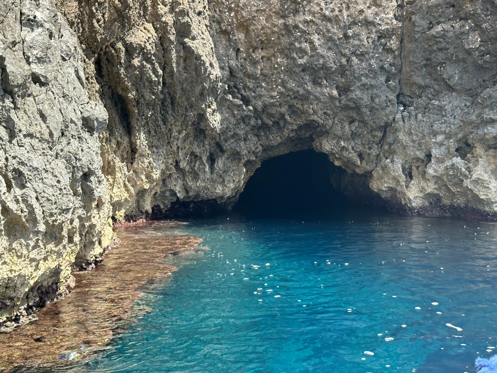 Our timing arriving at the Green Cave was perfect as there were two boats full of people that were just leaving so were had the place to ourselves. Unlike the blue cave, the green cave we could swim into. What makes this cave so unique is the two-foot diameter hole in the top that shines a beam of light down into the water. The green comes from the algae that grows on the rocks on the ceiling and under the water. The experience of floating in the beam of light was a bit surreal, reminding me a bit of the movie “Cocoon.” Unfortunately, I could not safely bring my phone in here so this is one of those experiences delegated to our memories.