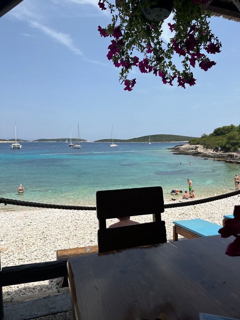 After so much swimming, we were ready for lunch so Ivan took us to a beautiful bay near the village of Rukavac, that had a charming restaurant overlooking the beach. We enjoyed smoked swordfish and smoked tuna carpaccio, along with a few salads, a fish sandwich, and a couple of drinks. I laughed when we docked and I asked Ivan where we would find the boat and he replied not to worry, “I will be in the bar…” At first I thought he was kidding so I joked, “Having some drinks, huh?” He replied in all sincerity, “Just one cold beer,” which I gladly bought him.