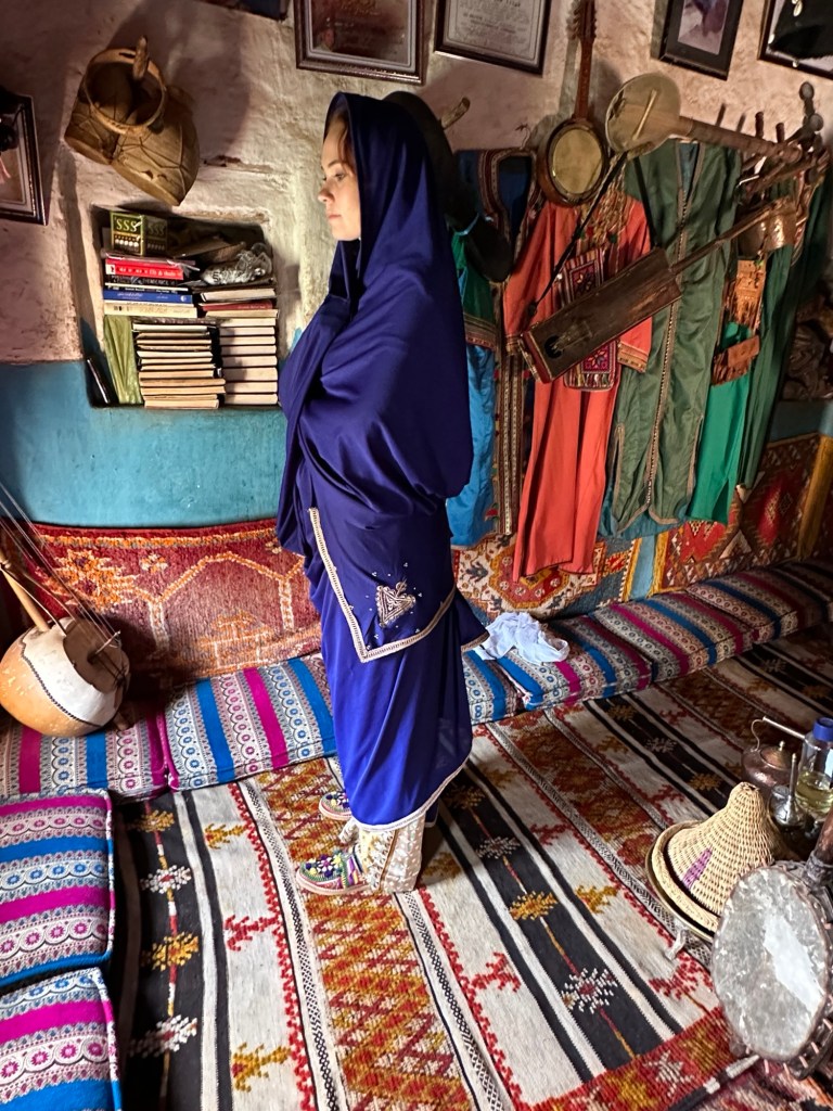 The third floor was reserved for guests who come to visit. Musafah invited us in, welcomed us to sit and prepared us some tea. He also dressed Jenny in a stunning blue kaftan and played a few of the traditional instruments he had (he also played an American banjo and did a mean rendition of “Oh! Susanna”).