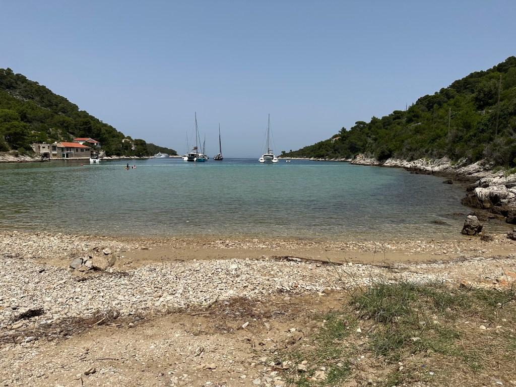 The beach we chose was the other sandy bottom beach on the island, Stončica. We parked as close as we could get and then made the five or so minute hike down to the isolated cove. There was a small restaurant there, a few families, and less than a half dozen boats moored – perfect! The water was the warmest we had experienced thus far, maybe because it was pretty shallow for quite a ways out but it still gave relief from the blazing hot sun.