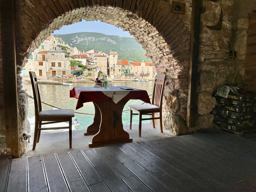 After an hour or so, we decided to move on to Komiza which is a less touristed town as there is no ferry port there. The day was still hot but seemed to be even more so on this side of the island. We walked down to the shore and a bit along the sea until we spotted a restaurant right on the water that looked like it was a nice spot for a drink. As soon as we walked in, I recognized the location from an article I had read about the filming locales on Vis – it was another scene from Mama Mia 2 (the arch where they dine overlooking the water).