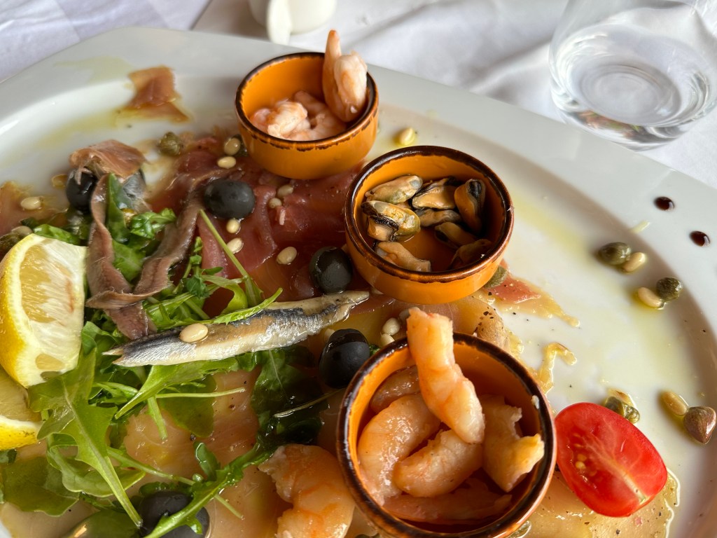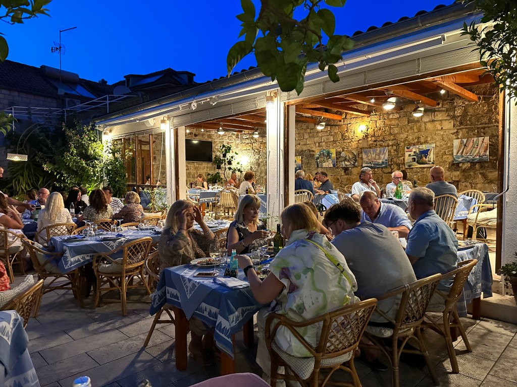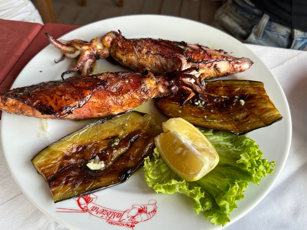 The view from taverna Konoba Jastozera was fantastic, the location perfect, and our lunch was delicious – a plate of various seafoods, including sardines and anchovies (we could handle the sardines but the anchovies were a no go), as well as a platter of grilled calamari and eggplant.