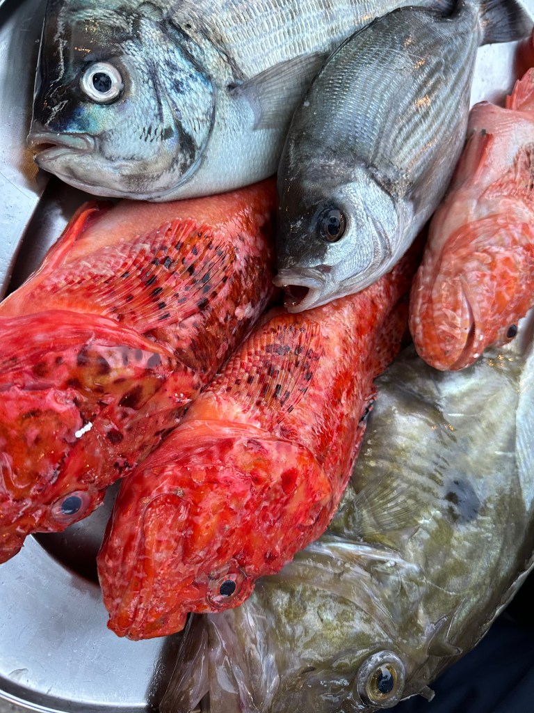 Dinner was at a lively taverna where we sat outside under a sprawling lemon tree. Since we had had such a late lunch we opted for dinner at 8:00 and to split a few items, including grandpa’s shrimp (I couldn’t resist trying his recipe, I thought it so sweet) and a whole grilled fish. The waiter brought a platter with a choice of three different fish in various sizes. We settled on the red scorpion fish and a side salad of cucumber, tomato, olives and creamy feta. Our meal was excellent and sweet Noella surprised us by insisting on picking up the tab.